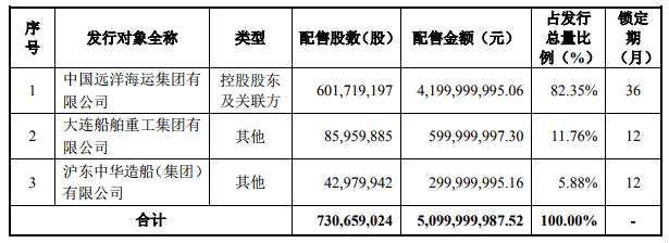 3月18日晚间,中远海能发布公告称,已经向中远海运集团、大船集团和沪东中华三家发行对象非公开发行股票7.3亿股,募集资金总额约为51亿元。