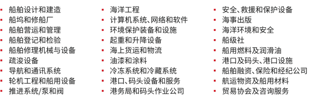 展会设船企展区、国际展区、邮轮产业展区、邮轮(客船)内装展、船用设备及先进材料展区、船舶通导展区、海上风电展区、海洋牧场展区、港口及航运服务展区,聚焦海内外船舶市场资讯,助力船企乘风破浪,迈向高质量发展。